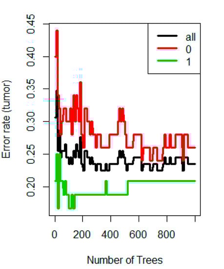 In our analysis, we compare the ability of radiomics to classify tumor differentiation compared to the mean ADC and venous enhancement values alone. Once the features were extracted using texture analysis, statistical machine learning was used to identify the performance of the combined set of texture features in the classification of tumors into well, moderately, and poorly differentiated classes. We used both a two-class (well vs. moderate/poor) and a multi-class (well vs. moderate vs. poor) random forest classification algorithm [22] for that purpose and then tuned the algorithm to optimize the parameters. The Gini index was used for split criterion. Parameters used in the multi-class classification were: Minimum leaf node size = 9, number of variables tried at each split = 44, and number of decision trees = 500. Predictor importance was estimated based on the minimal depth of the maximal subtree. If a predictor is influential in prediction, then the variable is likely to occur nearer to the root rather than the leaf nodes. The out-of-bag error from the random forest algorithm was used as the metric to quantify classification error and assess performance (Figure 3).