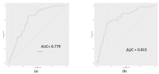 ROC curves showing the performance of models for classifying well from moderate/poorly differentiated tumors without (a) and with (b) radiomics-derived texture features in the two-class model.