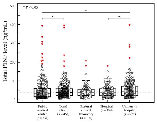 Baseline serum P1NP level during initial measurement by type of medical institution for 1331 Korean adults. The middle line represents the median, and the central box represents values from the lower to upper quartiles (25 to 75th percentiles). (○) represents individual serum P1NP result, and (▼) represents outlier.
