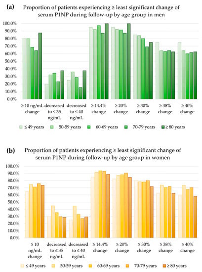 The proportion of patients experiencing changes in serum P1NP exceeding the least significant changes during follow-up: (a) in men and (b) in women.