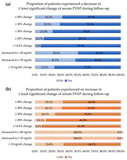 The proportion of patients that experienced changes in serum P1NP exceeding the least significant changes during follow-up: (a) in patients experiencing a decrease in serum P1NP and (b) in patients experiencing an increase in serum P1NP. ‘No’ represents no achievement of least significant changes, and ‘Yes’ represents an achievement of least significant changes.