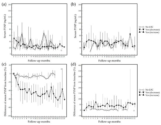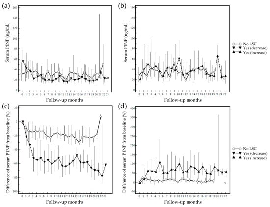 Changes in serum P1NP at follow-up (median serum P1NP level by follow-up month is presented and grouped based on least significant changes (LSC) ≥40% from baseline): (a) quantitative changes in patients who experienced a decrease in P1NP during follow-up; (b) quantitative changes in patients who experienced an increase in P1NP during follow-up; (c) %difference from baseline in patients who experienced a decrease in P1NP during follow-up; (d) %difference from baseline in patients who experienced an increase in P1NP during follow-up. ‘No’ represents no achievement of least significant changes, and ‘Yes’ represents an achievement of least significant changes.