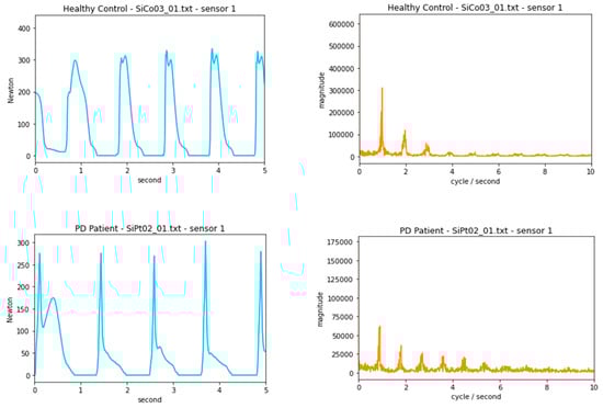Figure 1 shows a subset of the time domain and frequency domain data from one sensor of a healthy control and a PD patient. With a spectral analysis, the peaks in the frequency domain indicate the dominant frequency of approximately once per second, which matches the time domain and is within our expectation of normal walking speed []. The plot of the PD patients shows greater uncertainty and noise in the frequency domain, likely indicative of motor system-related issues [].