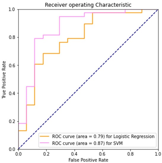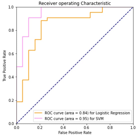 It is also valuable to look at its discriminatory ability, i.e., how well it can separate the positive and negative classes. The True Positive Rate (TPR) is the same as the Recall value, and the False Positive Rate (FPR) is higher than desired, which indicates less than optimal performance over the negative examples. By varying the decision thresholds, we can visualize the trade-off between TPR and FPR, the proportion of PD patients correctly classified and the proportion of healthy controls incorrectly classified, in the Receiver Operating Characteristic (ROC) curve. Area Under Receiver Operating Characteristic (AUROC) indicates the degree of separability; the higher the value, the more certain the model is in predicting each group. SVM’s higher AUROC indicates a superior performance in its ability to distinguish the two classes here (Figure 3).