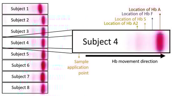 The dataset used in this research was recorded over the course of two years at Lady Reading Hospital in Peshawar, Pakistan. The strips were scanned and anonymized. The assessment and labeling of Hb electrophoresis images were performed by three independent haematologists. These were selected based on their post-graduate qualifications as haematologists. All three were responsible for diagnostic clinical work in their respective hospitals. Figure 4 shows sample raw electrophoresis images from the dataset. The database consisted of 103 strips containing electrophoresis images from 824 subjects. Each strip contained 8 patients’ images. A total of 824 images were analyzed. Images with a clear consensus on the quality of electrophoresis were included. Cases with poor images or diagnoses other than beta thalassaemia trait, as well as some normal images causing a data imbalance, were excluded. Finally, a total of 524 images were included in the analysis. A selection process was performed in order to have 50% in each class (thalassaemia or normal). After some preparations, each subject’s sample was applied on the test strip at the point of application, as shown in Figure 5. The bands were formed by Hb variants according to their weights. HbA moves faster and makes the first band, due to its lighter weight. Similarly, HbA2 moves slowly and is left behind, thus making the last band in the image due to its heavier weight. After the separation of haemoglobin, the diagnosis can be made on the basis of the percentage of each variant in the image.