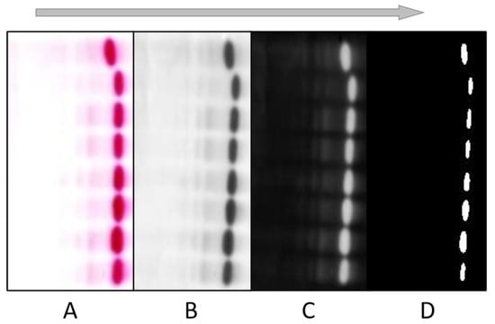 In electrophoresis images, most of the information lies in the low frequencies, whereas noise is present in high-frequency pixel values. A Gaussian filter, also known as blur filter, with a kernel size of 5 × 5 was applied to the complimented images. Gaussian filters are good for noise removal but the filtered image becomes blurred []. The noise removal capability and the associated blurring of the image can be adjusted via the selection of the appropriate parameters.