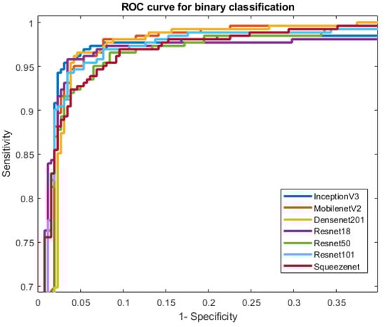 All the CNNs were implemented using the PyTorch library with Python 3.7 on an Intel Xeon CPU E5-2697 v4 @ 2.30 GHz and 64 GB RAM, with a 16 GB NVIDIA GeForce GTX 1080 GPU. Three comparatively shallow networks (MobileNetv2, SqueezeNet and ResNet18) and four deep networks (InceptionV3, ResNet 50, ResNet101 and DenseNet201) were evaluated in this study to investigate whether shallow or deep networks were more suitable for this application. Three different variants of ResNet were used to compare specifically the impact of shallow and deep networks with similar structures. The pre-trained CNN models were trained using the same training parameters and stopping criteria, as shown in Table 2. The stopping criteria meant that the training would be stopped if the validation losses did not decrease for five consecutive epochs, and epoch patience was used to decrease the learning rate if the validation loss did not decrease for a few consecutive epochs. Fifteen back-propagation epochs were used for the classification problem. Five-fold cross-validation results were averaged to produce the final receiver operating characteristic (ROC) curve, confusion matrix and evaluation matrices. The use of image augmentation and having a validation image set helped in avoiding the overfitting of the models [].
