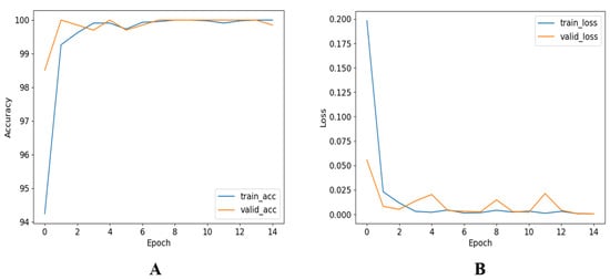 Training and validation (A) accuracy versus epoch and (B) losses versus epoch for the the best-performing trained CNN networks.