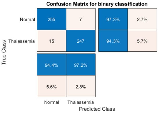 In summary, InceptionV3 demonstrated the highest classification accuracy of 95.8% in the classification of non-thalassaemia and thalassaemia images. Figure 10 shows the confusion matrix for the high-performing InceptionV3 model with thalassaemia and normal images. It can be noted that for the best-performing network, 15 out of 262 thalassaemia images were misclassified as normal images and 7 out of 262 normal images were misclassified as thalassaemia images. This is clearly an outstanding performance for any computer-aided classifier and this can significantly help in the fast screening of thalassaemia by clinicians immediately after acquiring the images. It can be seen that MobileNetV2 was the best-performing network according to elapsed time per image (te), as shown in Figure 11, and it had the lowest number of parameters, as shown in Table 4. Finally, it can be observed that MobileNetV2, being a shallow network, produced very good accuracy, precision and recall values of 95.72%, 95.73% and 95.72%, respectively, which were very close to the accuracy, precision and recall of 95.8%, 95.84%, and 95.8%, respectively, for InceptionV3, which is a deep network.
