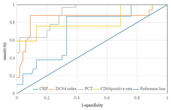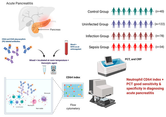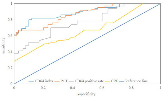 In recent years, the application of flow cytometry to detect the expression of CD64 on the surface of peripheral blood neutrophils has attracted extensive attention in the diagnosis of bacterial infection. CD64 mRNA in neutrophils began to express 1~3 h after infection, and CD64 on the cell surface could be detected up-regulated 3~6 h after infection, which has the ability to detect infection early [33]. Rogina et al. also showed that the differentiation of CD64 index and CD64 positive rate in each group of acute pancreatitis was higher. The CD64 index, CD64 positive rate, and PCT in the infected group were significantly higher than those in the uninfected group (all p < 0.05), but there was no significant difference in CRP between the two groups (p > 0.05). It may be that CRP primarily reflects the acute stress state in vivo, and the basic CRP in patients with acute pancreatitis is higher. The increase was not obvious during infection. Previously, CRP shows low specificity and limited correlation with the disease activity in comparison to other infection indexes [34].