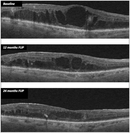 In treated eyes, we found a significant reduction in CMT, with a stabilization of both BCVA and electrophysiological parameters. Mean CMT decreased from 406.52 µm (±138.74) at baseline to 310 µm (± 130.39) at 24 months (p = 0.008), whereas the mean BCVA varied from 55.70 ETDRS letters (±24.07) to 54.58 ETDRS letters (± 23,11) at 24 months (p = 0.698). Figure 1 shows CMT variation from baseline to months 12 and 24.