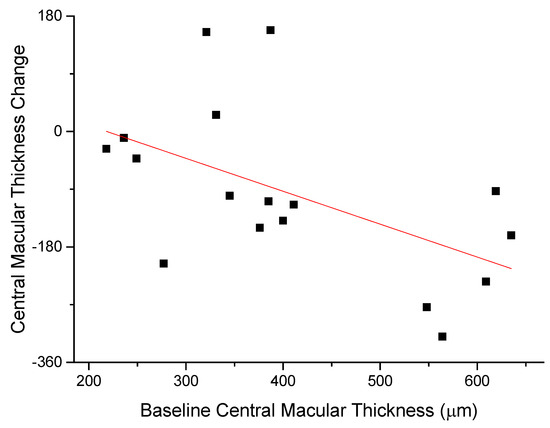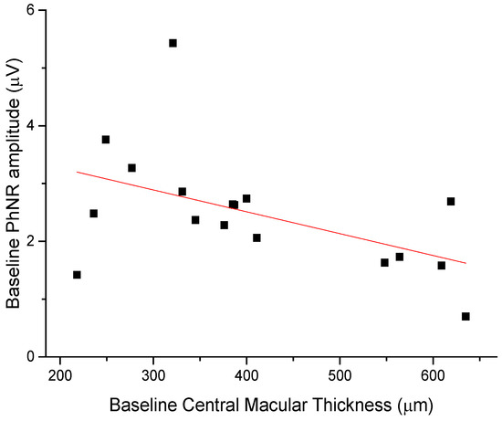 The anti-edema effect tended to be stronger in patients with the poorest baseline retinal morphology (CMT) and function (PhNR). At baseline, PhNR amplitude and BCVA were negatively correlated with CMT (see Figure 2 and Figure 3; r = −0.7, p < 0.01; r = −0.5, p < 0.05, respectively). At the end of follow-up, the change in CMT was negatively correlated with baseline CMT (Figure 4, r= −0.53, p = 0.03) and positively with baseline PhNR amplitude (Figure 5, r = 0.58, p < 0.01).