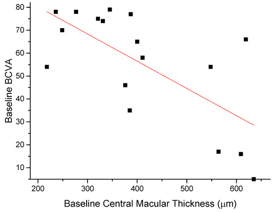 Baseline BCVA was negatively correlated with CMT (r = −0.5, p < 0.05).