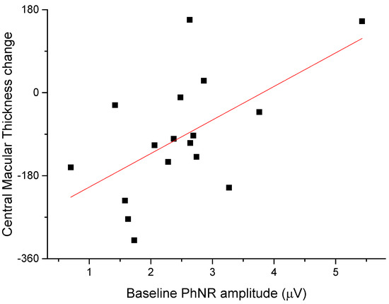 At the end of follow-up, the change in CMT was positively correlated with baseline PhNR amplitude (r = 0.58, p < 0.01).