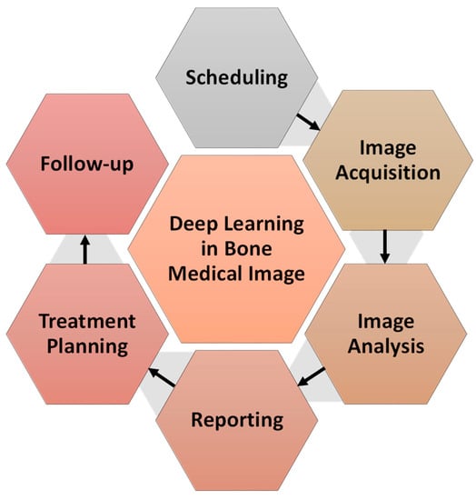 Currently, many AI techniques, in particular deep learning (DL) research, are going on to help medical practitioners by automating the image processing and analytics even in co-clinical trials, a process known as “computational radiology” [4]. Detection of clinical findings, identifying the illness extent, characterization of clinical conclusions (e.g., into malignant and benign tissue), and various software techniques, which can be widely referred to as decision support systems, are all examples of computerised tools that can be built. Due to time constraints and a lack of visualisation and quantification capabilities, these are rarely incorporated in today’s radiological reports. The various illustrations of DL in bone radiology are shown in Figure 2.