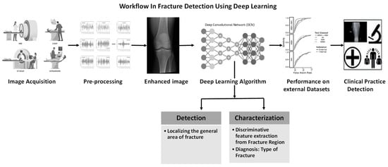 Bone fracture from X-ray is another one of the most common injuries these days. Every year, the number of fractures occurring across the EU6 nations, Sweden, Germany, Italy, France, Spain, and the UK, is 2.7 million [5]. Doctors face various difficulties in evaluating X-ray images for several reasons: first, X-rays may obscure certain bone traits; second, a great deal of expertise is required to appropriately diagnose different forms of fractures; and third, doctors frequently have emergency situations and may be fatigued. It was observed that the efficiency of radiologists in the evaluation of musculoskeletal radiographs reduces by the end of the workday compared to the beginning of the workday in detecting fractures [6]. In addition, radiographic interpretation often takes place in environments without the availability of qualified colleagues for second opinions [7]. The success of the treatment and prognosis strongly depends on the accurate classification of the fracture among standard types, such as those defined by the Arbeitsgemeinschaft für Osteosynthesefragen (AO) foundation. In that context, a CAD system that can help doctors might have a direct impact on the outcome of the patients. The possible solution for fracture detection using deep learning is shown in Figure 3.