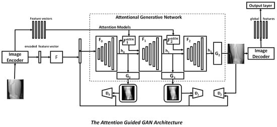ResNet [21], VGGNet [22], and Inception Net [23] illustrate a research trend that started with AlexNet [12] to make networks deeper and used in abnormality visualization in bone. DenseNet [24,25] and U-Net [16] show that using skip connections facilitates a deep network that is even more advanced. The U-net was created to keep-up with segmentation, and other networks were developed to perform image classification. Deep supervision [26] boosts discriminative ability even more. Bone imaging, including medical image restoration, image quality improvement, and segmentation, makes extensive use of adversarial learning. When summarising bone image data or developing a systematic decision, the attention mechanism enables the automated detection of “where” and “what” to concentrate on. Squeeze and excitation are two mechanisms that can be used to control channel attention. In [27], attention is combined with the generative adversarial network (GAN), while in [28], attention is combined with U-Net. Figure 4 shows a general architecture of attention-guided GAN. GANs are adversarial networks consisting of two parts: a generator and a discriminator. A generator learns the important features and generates feature maps by mapping them to a latent space. The discriminator learns to distinguish the feature maps generated by the generator from the learnt true data distribution. Attention gates are involved in the pipeline in order to represent the important feature vectors efficiently without increasing the computation complexity. The learnt features, which are in the form of a distribution of raw vectors, are then fed into an image encoder. It is then fed into an output layer to provide the required output.