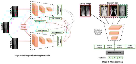 DL in bone imaging need to adapt feature representation capacity obtained from existing models and data to the task at hand, even if the models and data are not strictly within the same domain or for the same purpose. This integrative learning process opens the prospect of working with various domains including multiple heterogeneous tasks for the first time. One possible approach to solve new feature learning is the self-supervised learning shown in Figure 5. In Figure 5A, the target images are shared with the image encoder wherein the encoder learns the important patterns/features by resampling them into a higher dimensional space. These learnt local features are then propagated to the output layer. The output layer may consist of a dense layer for classification or a 1 × 1 convolutional layer for segmentation/localisation of the object. Figure 5B is used for the transfer of the learnt features to a modified architecture to serve the purpose of reproducibility of the model. Multiple such learnt features are then collected as model weights which undergo an embedding network. This enables the model to perform multiple tasks at once via a multi-headed output.