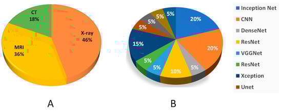 (A) Represents the usage of different modalities in deep learning. (B) Usage of deep learning models for fracture detection.