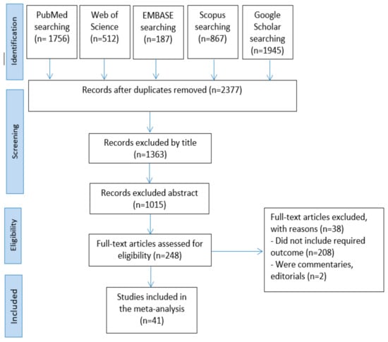 A total of 5,267 articles were obtained from the search in the five databases: PubMed (n = 1756), Web of Science (n = 512), EMBASE (n = 187), Scopus (n = 867), and Google Scholar (n = 1945). The remained number of articles after omitting the duplicates was 2377. Then, 1363 and 1015 articles were removed by title and abstract screening, respectively. The full texts of the remained 248 articles were assessed. Finally, 207 articles were excluded for not meeting the inclusion criteria. The screening process resulted in 41 articles being accepted for qualitative synthesis and meta-analysis (Figure 1).
