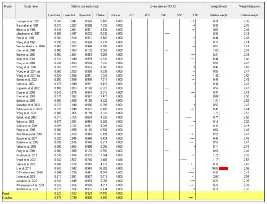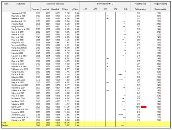 The effect analysis of the 41 included articles ii the current meta-analysis showed that the sensitivity points of estimate were 0.925 and 0.876 according to the fixed and random models, respectively. In addition, the specificity points of estimate were 0.899 and 0.848 according to the fixed and random models, respectively. The Q value calculated by the homogeneity test shows that sensitivity and specificity of 13C/14C-urea breath tests in the diagnosis of H. pylori infection data have a heterogenous structure (Q = 2137.239; p < 0.001) and (Q = 2689.815; p < 0.001). Accordingly, the author achieved the current meta-analysis following the random-effects model to reduce the misapprehensions produced by the article’s heterogenicity. The total actual heterogeneity between the included articles (tau value) was 1.830 and 1.809 for sensitivity and specificity, respectively.