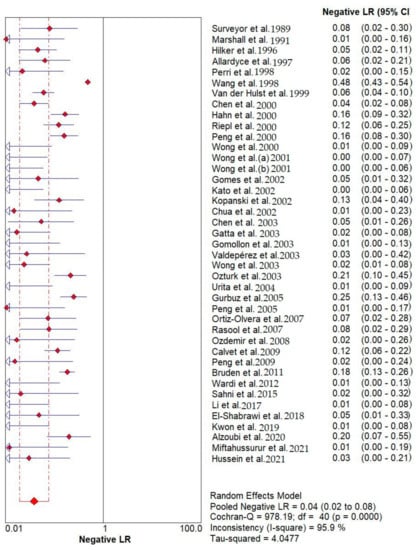 Pooled urea breath test result. Overall likelihood ratio for negative test [32,33,34,35,36,37,38,39,40,41,42,43,44,45,46,47,48,49,50,51,52,53,54,55,56,57,58,59,60,61,62,63,64,65,66,67,68,69,70,71,72].