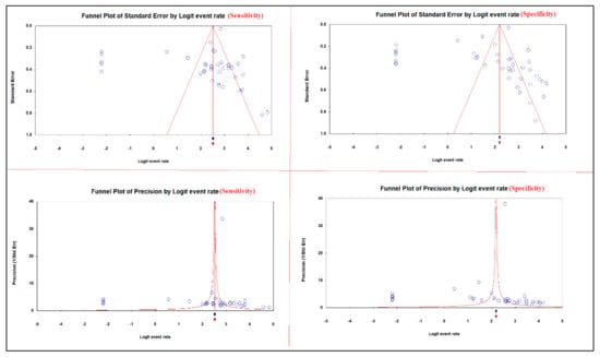 Begg and Mazumdar test showed a moderate relationship between the sensitivity of 13C/14C-urea breath tests in the diagnosis of H. pylori infection, tau with and without continuity correction; values were 0.28729 and 0.28851, respectively. Furthermore, a strong relationship between the sensitivity of 13C/14C-urea breath tests in the diagnosis of H. pylori infection, tau with and without continuity correction values were 0.39560 and 0.39683, respectively. Egger’s test for a regression intercept provided p-values of 0.02528 and 0.02771 for sensitivity and specificity, respectively, indicating the presence of publication bias (Table 4).