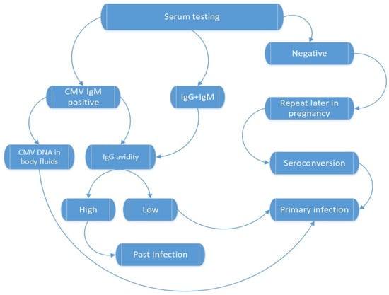 Both CMV-specific IgM and IgG antibodies must be tested in the maternal blood. Serum CMV IgM is present in both primary and secondary forms of the disease and represents a diagnosis of maternal CMV infection (Figure 1) [5,23].