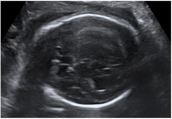Congenital CMV fetal infection may be associated with a variety of CNS abnormalities. Those may be severe or mild; appear due to the early inflammatory, destructive, and obstructive processes of the brain infection; and directly influence fetal prognosis [60]. Ventriculomegaly (more than 15 mm), microcephaly (a decrease of less than two standard deviations), high echogenicity in the periventricular areas, and hydrocephaly may appear as severe intracranial signs. Increased cisterna magna (more than 8 mm), vermian hypoplasia, periventricular cysts, agenesis of the corpus callosum, lissencephaly, and porencephaly are often associated with congenital CMV infection [4,5,61]. Of these, ventriculomegaly and microcephaly are associated with the worst fetal prognosis. The mild cerebral findings related to fetal involvement include ventriculomegaly enlargement (10 to 15 mm) (Figure 3), intracranial calcifications (Figure 4), cysts of the choroid plexus, subependymal cysts, and intraventricular synechiae [62,63].