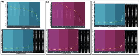 In the fetus with CVD, the GSI was continuously measured below the fifth percentile [10]. Second, using FetalHQ, the size and shape of each ventricle were evaluated in 24-segment ventricular analysis and 24-segment sphericity index (SI) analysis, respectively. Twenty-four-segment ventricular analysis involves the evaluation of transverse widths by dividing the ventricle into segments at end diastole. At a GA of 35+2 weeks, the analysis of the fetus with CVD showed that the RV was wider than the reference value and was particularly prominent in the base (1–8) and mid (9–16) regions, while the LV was well in line with the median z score (Figure 4B upper). These findings were commonly observed at 33+5 weeks GA (Supplementary Figure S1). The 24-segment sphericity index (SI) is used as an indicator of diastolic shape and is calculated by dividing the ventricle into segments. At a GA of 35+2 weeks, the fetus with CVD had an all but one of SI value in the base segment (1–8) that was below the tenth percentile, while the value of the SI in the LV was in the normal range (Figure 4A,B lower graph). This result indicated that the base region of the RV had an abnormal globular shape. These findings had also been continuously observed before (Supplementary Video S1). On the other hand, the healthy lower fetus had a 24-segment SI in both ventricles that was greater than the 10th percentile at the same GA (Figure 4C).