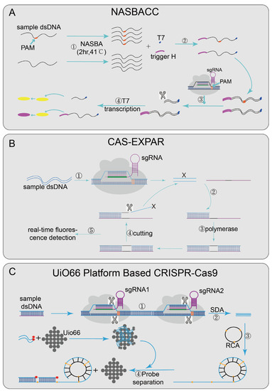 - Huang, M.; Zhou, X.; Wang, H.; Xing, D. Clustered Regularly Interspaced Short Palindromic Repeats/Cas9 Triggered Isothermal Amplification for Site-Specific Nucleic Acid Detection. Anal. Chem. 2018, 90, 2193–2200. [Google Scholar] [CrossRef]