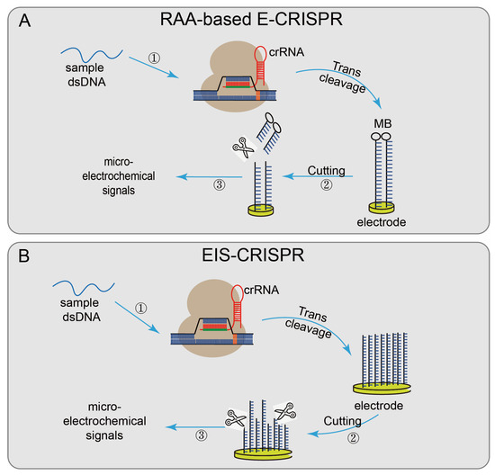 - Dai, Y.; Somoza, R.A.; Wang, L.; Welter, J.F.; Li, Y.; Caplan, A.I.; Liu, C.C. Exploring the Trans-Cleavage Activity of CRISPR-Cas12a (cpf1) for the Development of a Universal Electrochemical Biosensor. Angew. Chem. Int. Ed. Engl. 2019, 58, 17399–17405. [Google Scholar] [CrossRef]