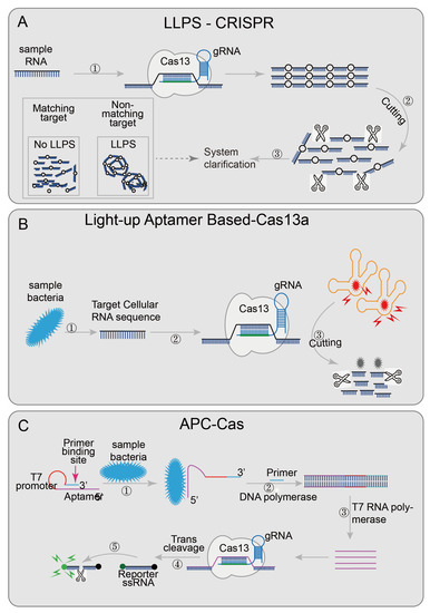 - Spoelstra, W.K.; Jacques, J.M.; Gonzalez-Linares, R.; Nobrega, F.L.; Haagsma, A.C.; Dogterom, M.; Meijer, D.H.; Idema, T.; Brouns, S.J.J.; Reese, L. CRISPR-based DNA and RNA detection with liquid-liquid phase separation. Biophys. J. 2021, 120, 1198–1209. [Google Scholar] [CrossRef] [PubMed]
