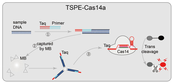 - Song, F.; Wei, Y.; Wang, P.; Ge, X.; Li, C.; Wang, A.; Yang, Z.; Wan, Y.; Li, J. Combining tag-specific primer extension and magneto-DNA system for Cas14a-based universal bacterial diagnostic platform. Biosens. Bioelectron. 2021, 185, 113262. [Google Scholar] [CrossRef]