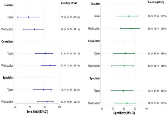 Across all three levels of reader experience, Se and Sp did not differ significantly between tablet and workstation readings. There was no significant difference in reading performance between the devices (Figure 3).