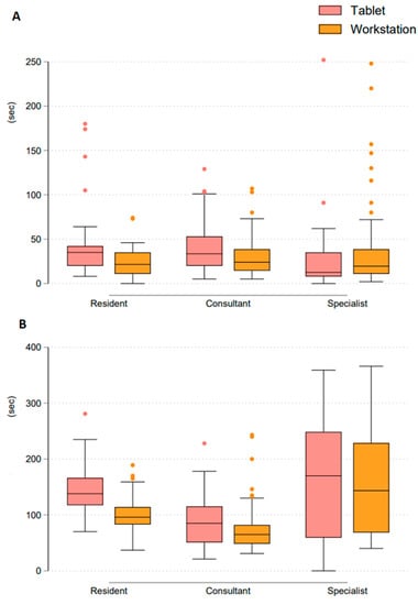 Reading times did not differ significantly between tablet and workstation in all experience groups (Figure 4).
