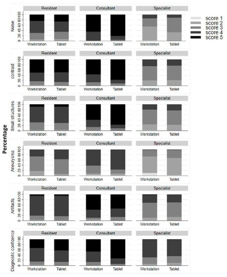 The specialists rated the workstation as well as the tablet with minor artifacts affecting visualization of minor structures but diagnosis as still possible (rating 3) (p = 0.417). The residents rated both the workstation and the tablet as minor artifacts not interfering with diagnostic decision making (median score 4) (p = 0.211) (Figure 5).