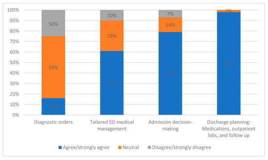 Survey Data: ED providers’ impressions of the clinical areas where personalized, risk-based CDS would be most useful. Bars represent percentage of providers responding “agree/strongly agree”, “neutral”, or “disagree/strongly agree” to each potential motivator of use.