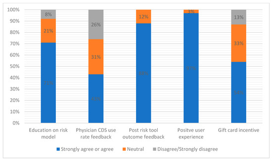 Table 3 and Figure 2 present ED provider perspectives on using an ML-based risk model for ED patients with AHF. Among all surveyed physicians, only 8% disagreed or strongly disagreed that they would feel comfortable using an ML-based model to assist with decision-making after they were first educated on how the model worked. Many physicians recognized the benefits of ML-based models but expressed some fear using something they did not fully understand (concern over what variables were included and how the algorithm works). Clinicians would be more comfortable if the models were biased conservatively to decrease the risk of serious adverse events. Receiving education on how the risk tool and CDS works and feedback on patient outcomes after use were seen as opportunities for increasing acceptance.