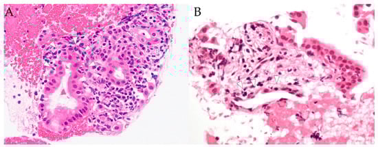 Histopathological tissue obtained using EUS-FNB from a patient with a confirmed diagnosis of type 2 autoimmune pancreatitis. (A,B) Histological examination of specimens showing GELs (arrowhead, hematoxylin–eosin stain, ×40).