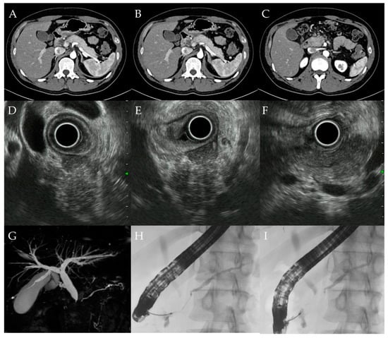 Image findings of case 10. (A–C) Computed tomography (CT) showing diffuse pancreatic enlargement. (D–F) Endoscopic ultrasound showing diffuse pancreatic enlargement and a mass in the pancreatic head. (G) Magnetic resonance imaging showing intrapancreatic bile duct stenosis and MPD narrowing. (H,I) Endoscopic retrograde cholangiopancreatography (ERCP) showing MPD narrowing and intrapancreatic bile duct stenosis.