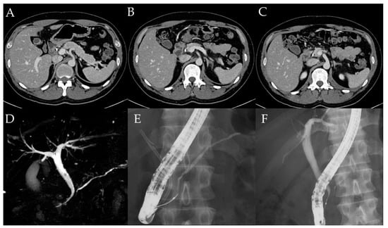 Imaging findings after steroid introduction. (A–C) CT. (D) Magnetic resonance cholangiopancreatography. (E,F) ERCP. Pancreatic enlargement, MPD stenosis, and bile duct stricture all improved after steroid introduction.
