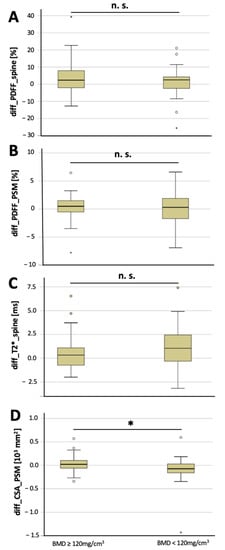 Longitudinal changes over 6 months in non-osteoporotic/osteopenic patients (≥120 mg/cm3) and in osteoporotic/osteopenic patients (BMD < 120 mg/cm3). Changes in vertebral PDFF (A, diff_PDFF_spine), changes in PSM PDFF (B, diff_PDFF_PSM), changes in vertebral T2* values (C, diff_T2*_spine) and changes in CSA of the PSM (D, diff_CSA_PSM) between baseline and 6-month follow-up (asterisks indicate significant difference). Boxplots: ° = outlier; * = extreme outlier.