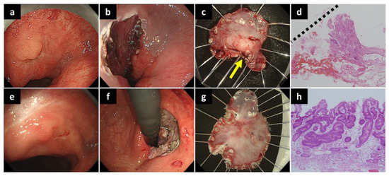 - Takenaka, R.; Kawahara, Y.; Okada, H.; Tsuzuki, T.; Yagi, S.; Kato, J.; Ohara, N.; Yoshino, T.; Imagawa, A.; Fujiki, S.; et al. Endoscopic submucosal dissection for cancers of the remnant stomach after distal gastrectomy. Gastrointest Endosc. 2008, 7, 359–363. [Google Scholar] [CrossRef]