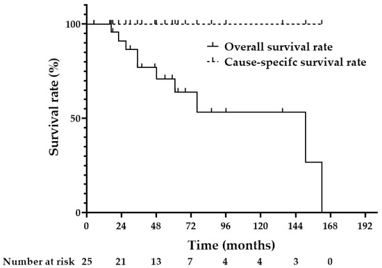 The 5-year OS and cause-specific survival rates were 71.0% and 100%, respectively (Figure 4). During the observation period, 10 patients (40%) died of other causes: two of pneumonia, one of prostate cancer, one of hypopharyngeal cancer, one of lung cancer, one of drowning from a fall into the river, and four of unknown causes.