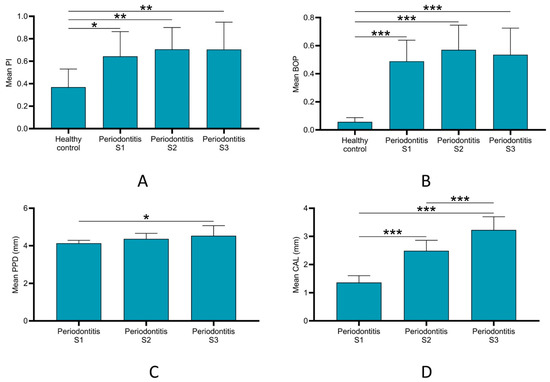 Mean PI and BOP were significantly higher in all stages of periodontitis as compared to the control group. However, no significant differences were detected between the different stages of the periodontitis groups (Figure 2A,B). For PPD, only the periodontitis S3 group showed significantly higher mean PPD as compared to the periodontitis S1 group (p < 0.05) (Figure 2C). On the other hand, the periodontitis S3 group exhibited significantly higher (p < 0.001) mean CAL than the periodontitis S1 and S2 groups. The latter group also showed significantly higher (p < 0.001) CAL than the periodontitis S1 group (Figure 2D).