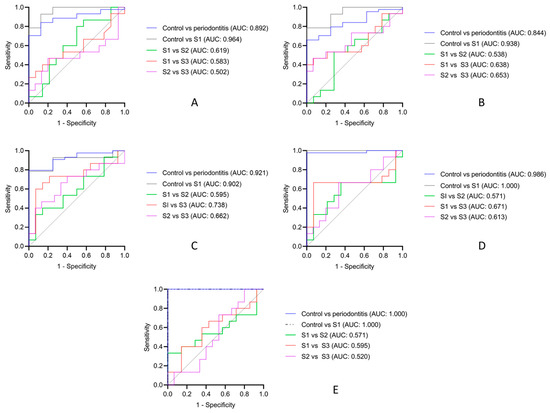 All other biomarkers also showed high sensitivity, ranging from 0.786 to 0.977, and specificity, ranging from 0.750 to 1.000, in the differentiation of control vs. periodontitis and control vs. S1 periodontitis.