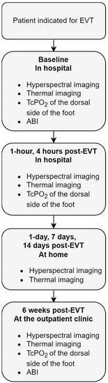 HSI is a technique that uses visible light spectroscopy to estimate the concentration of oxyhemoglobin (OxyHb) with 2 absorption peaks at approximately 542 nm and 578 nm and deoxyhemoglobin (DeoxyHb) with a single absorption peak at approximately 554 nm in the upper 1 to 2 mm of the skin [16]. Intra- and inter-observer reliability of this technique is previous described by Kleiss et al. [22] Thermal imaging determines the temperature of the skin with infrared light [23]. HSI was performed with the HyperView system (HyperMed Inc., Memphis, TN, USA). Thermal imaging was performed with a forward-looking infrared (FLIR) camera (FLIR Systems Inc., Wilsonville, OR, USA). Both systems are hand-held cameras that are easy to use and therefore facilitate monitoring patients over time. HSI and thermal imaging were performed pre-EVT at the day of admission, which was considered the baseline measurement for each patient. Six follow-up measurements were performed (Figure 1): 1 h and 4 h post-EVT at the surgical ward, 1 day, 7 days, and 14 days post-EVT at home (unless the patient was in hospital for an appointment), and during the regular scheduled outpatient clinic visit 6 weeks post-EVT.