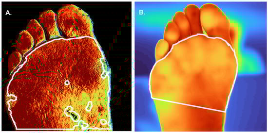 Example of manual segmentations of a thermal and hyperspectral image taken pre-operatively. The patient was a former smoker with Rutherford class 3. (A) Hyperspectral image (HSI) of oxyhemoglobin of the plantar side of the foot measured with the HyperView. A darker red color means a higher oxyhemoglobin value. (B) Thermal image of the plantar side of the foot measured with the forward-looking infrared (FLIR) camera. More yellow in the color of the foot means a higher temperature value. The white line represents the manual segmentation after preprocessing.