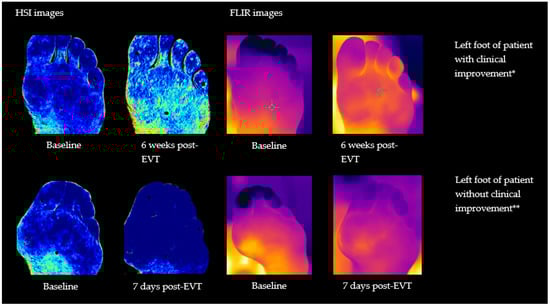 The actual improvement of tissue perfusion post-EVT is not regularly assessed, but seems crucial for predicting wound healing, decrease in ischemic pain, and to detect whether additional interventions or early reinterventions are needed [8,9,10,11,12]. PAD patients would benefit if these measurements could be performed at their homes. Lower-limb perfusion may gradually improve during the first weeks after the procedure, but previous studies are inconclusive about when improvement can be expected and the correlation with clinical outcomes [13,14]. Hyperspectral imaging (HSI) and thermal imaging are two techniques that may be suitable for monitoring tissue perfusion post-EVT, both in hospital and at home. Both techniques are non-invasive, contact-free, and are hand-held cameras that are easy to use in the home setting of patients [15,16,17].